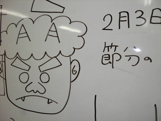 もうすぐ節分です~♪ 記事のテーマ:つぶやき,みんなのお楽しみ 年が明けて早いものでもう1月も終わろうとしています。 2月も目前ですね(*_*) 2月といえば節分ですよね!ということで、この日は利用者様と鬼のお面作りをしました(*^_^*) 台紙に好きな形で鬼を書いていただきました♪ 見本をホワイトボードに書いていたのですが、見本の鬼よりもリアルな鬼がいっぱいできました\(^o^)/ お面を作った後はもちろんみなさんで集合写真!鬼が沢山集まっててちょっと怖かったです・・・・