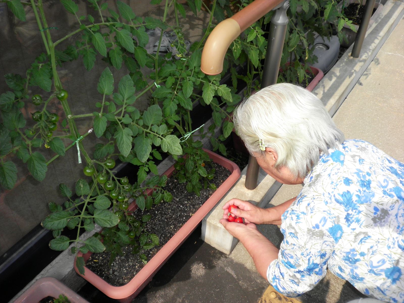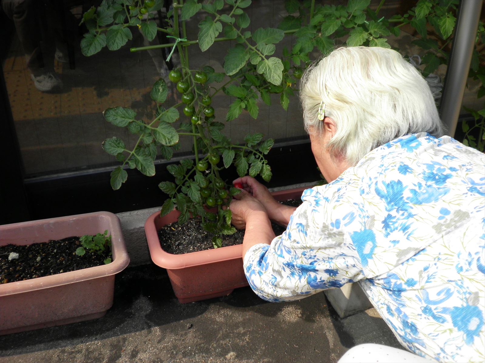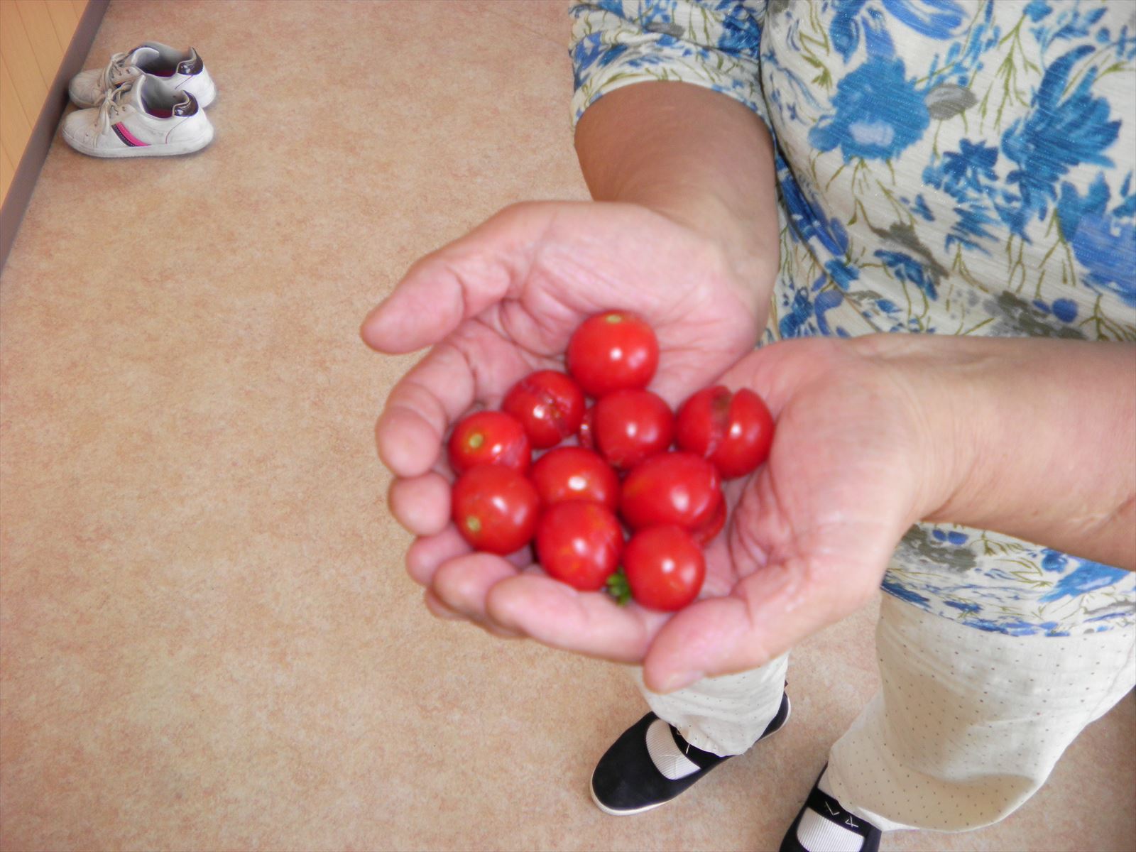ついに収穫!! 記事のテーマ:つぶやき,みんなのお楽しみ,今日のみんなの木 みんなの木のちっちゃな菜園で、ついにミニトマトの収穫です! 先日は雨降りだったので、収穫を見送っておりましたが本日晴天収穫日和(^v^) 利用者様に収穫のお手伝いをしていただきました♪ 日当たり良好なので、とても甘くておいしかったです★ まだまだ実がなっていたので、これからたくさん収穫できそうです♪