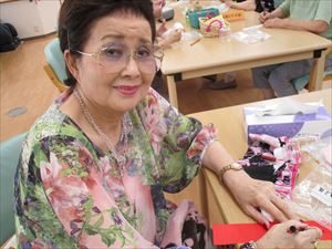 風鈴つくりの最大の難関は、紐にビーズを通すこと。ビーズの穴は大きいのですが、手が震えてなかなか入らない。と、あちらこちらのテーブルからこえが聞かれていましたが、同じテーブルの方々が協力して、穴に通しておられました。
