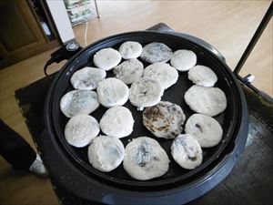 皆様熱心に もちをこねて、餡を入れて焼きました。