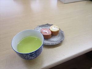 おやつは、紅白のロールケーキ