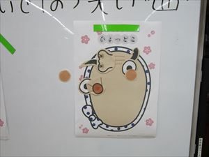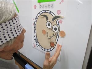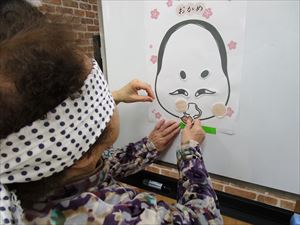ボードの前に立ち、目隠しをして、おかめとひょっとこを作ります。