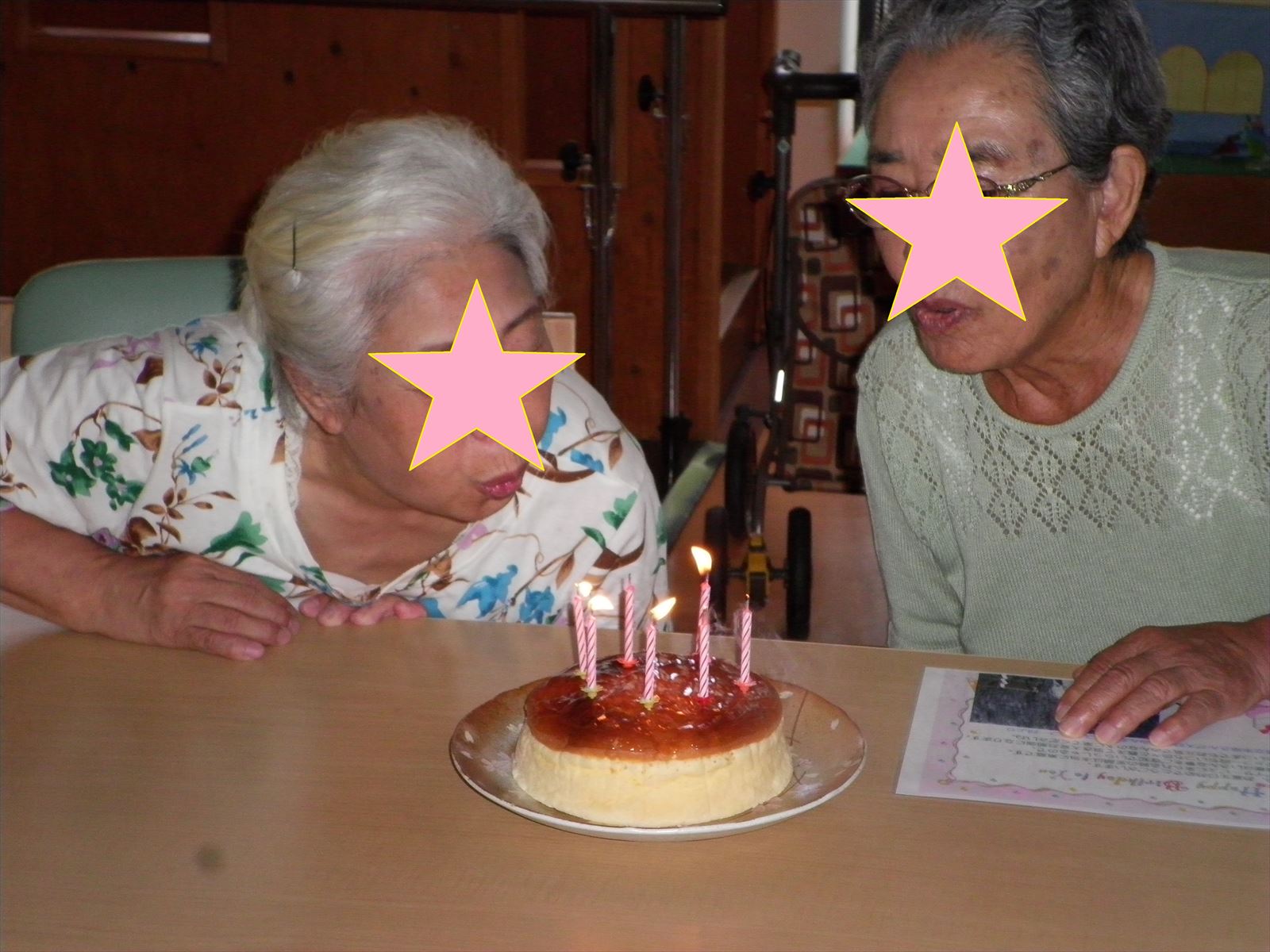 ご利用者様皆さんで『ハッピバースデー』を歌ったり、生まれた年の出来事を施設長自ら面白おかしくご紹介したり、スタッフからは写真入りのカードをプレゼントりたり・・と。