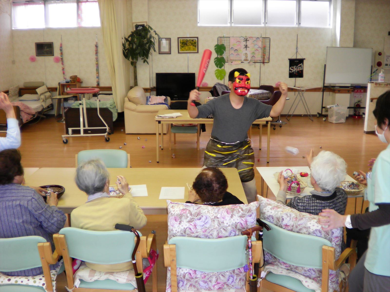 本日、2月3日は節分! 今日はスタッフが鬼になり、鬼退治をご利用者様の皆様にやって頂きました。 本当であれば、本物の豆を使ってやるのが良いのですが、ゲームも一緒にやりましたので豆の代わりに、チラシで作った豆ボールを使って…続きを読む